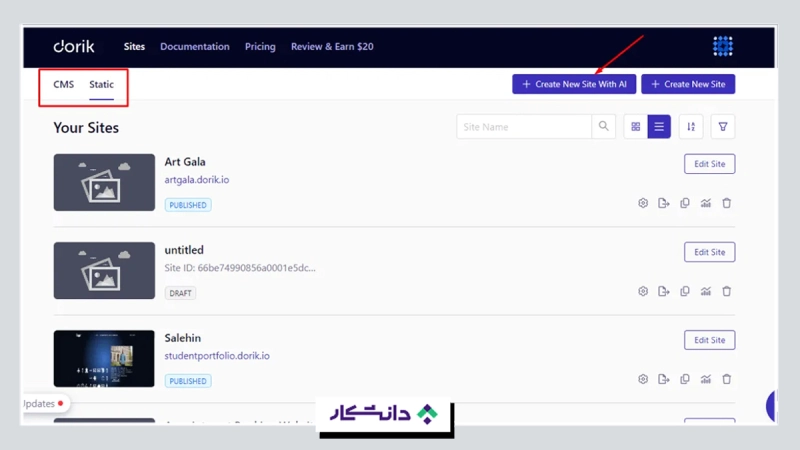 ۳. بر روی گزینه Create New Site with AI کلیک کنید.