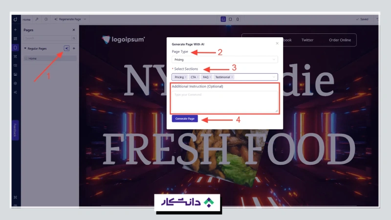 در نوار کناری سمت چپ بر روی Pages کلیک کرده و آیکون AI را انتخاب کنید (Create New Page with AI).