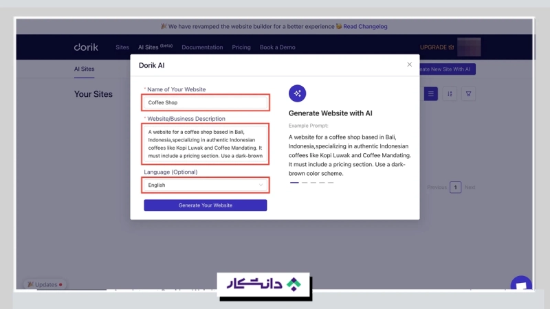 ۴. نام سایت خود را وارد کرده، یک توضیح جامع (Prompt) برای طراحی سایت ارائه دهید و زبان مورد نظر را از منوی کشویی انتخاب کنید.