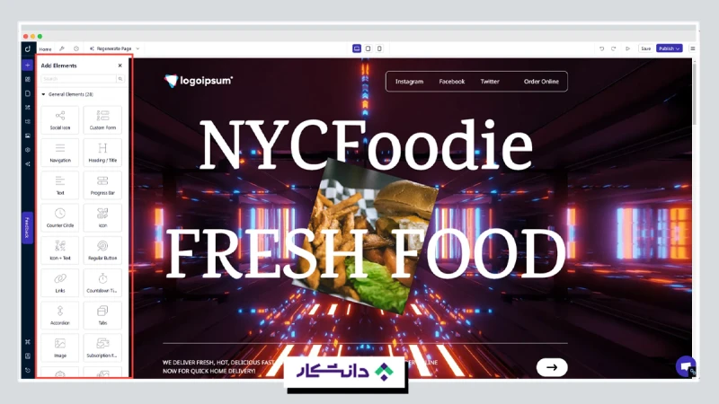 از ویرایشگر Drag & Drop برای افزودن المانهای جدید همچون ویدیو، فرم، دکمه و سایر عناصر استفاده کنید. امکان تغییر اندازه کانتینرها با کشیدن موس نیز وجود دارد.